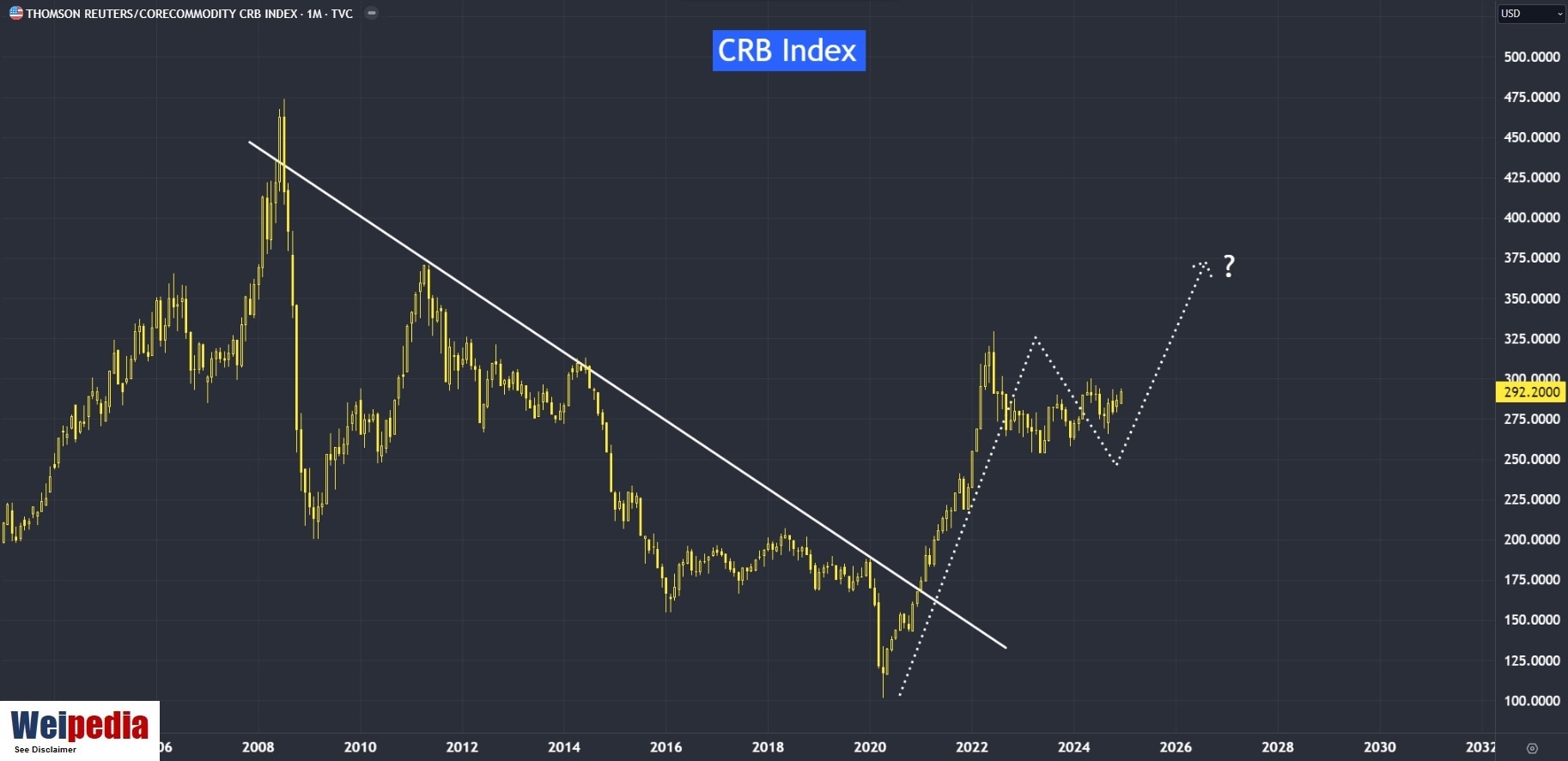 The latest Federal Open Market Committee (FOMC) decision may offer some clues. The Fed lowered rates by a quarter point but signaled two additional cuts for 2025, reflecting greater caution about how quickly they can continue reducing borrowing costs. Meanwhile, since inflation hit its low of 2.4% in September, it has been climbing—reaching 2.6% in October and 2.7% in November. This has raised concerns that inflation may be stalling above the Fed’s 2% target, prompting several US Fed officials to express a preference for slowing the pace of rate cuts. US Fed Governor Michelle Bowman emphasized that inflation remains uncomfortably above the Fed’s goal. The Fed’s cautious approach is well-founded. The CRB Index, a long-established benchmark for commodities, closely mirrors the movements of the US CPI. This weighted index, comprising 19 commodities across various sectors, recently broke above its long-term downtrend, signaling the potential for higher commodity prices following the current retracement.
